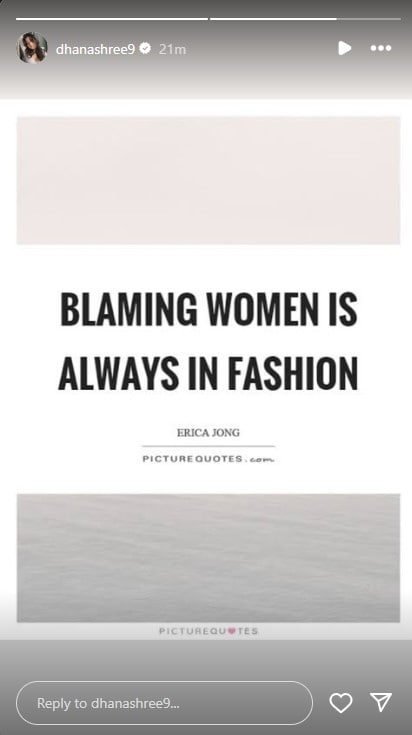 On Monday, Dhanashree posted a cryptic line on her Instagram story which read: “Blaming women is always in fashion”