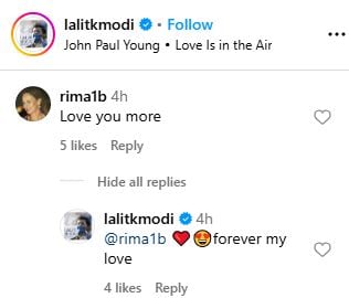 “My forever love,” Lalit Modi responded to her comment.
