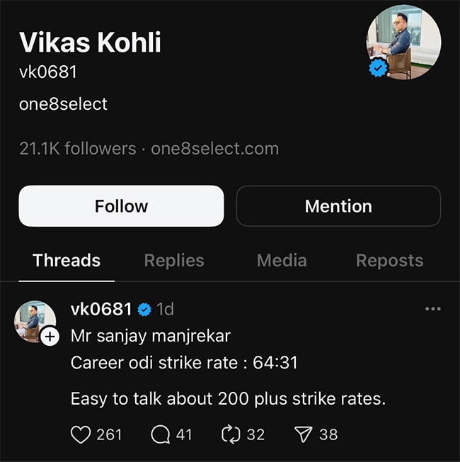 Vikas took a dig at the former cricketer on social media platform Threads. “sanjay manjrekar.Career odi strike rate : 64:31.Easy to talk about 200 plus strike rates,” wrote Vikas.